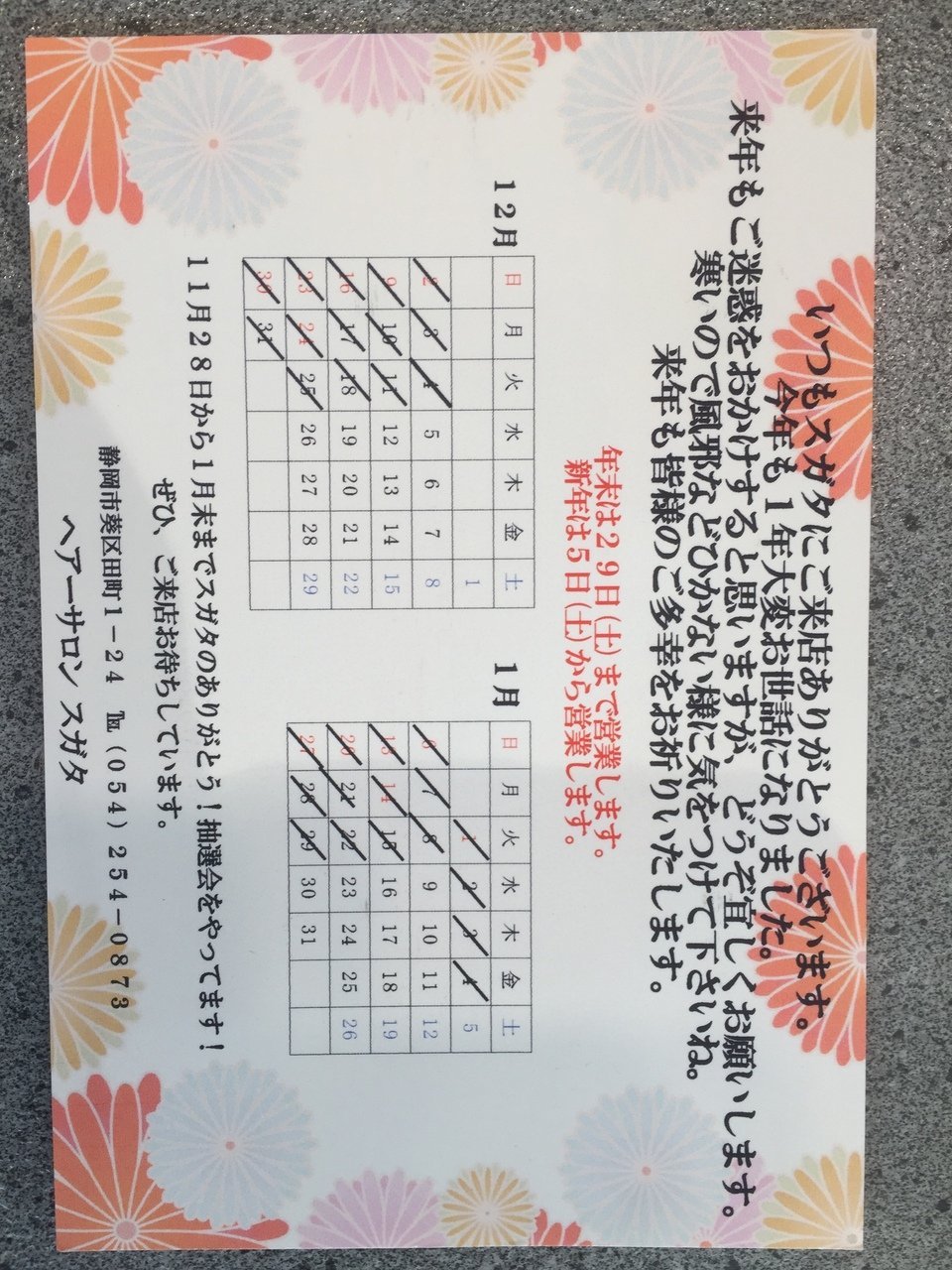 2018年12月5日 年末年始の予定です。 今年もあとわずかですね! 風邪などひかないように 気をつけて下さい✨