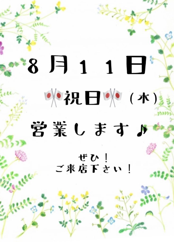 8月11日(木)の祝日は営業します!! まだ、予約の枠も空いていますので ぜひ!ご来店下さい♪