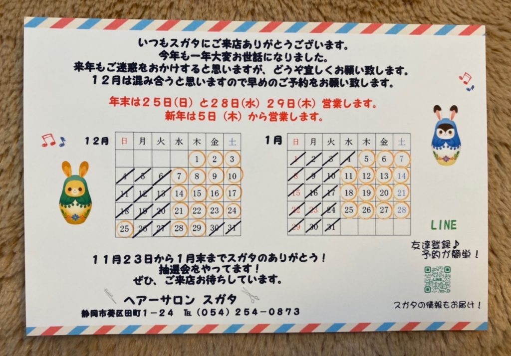 朝晩と冷えますね! 風邪ひかない様に体調に気をつけて下さい♪ 年末年始の営業日になります! 早めのご予約をお勧めします😊🎶 宜しくお願い致します。 息子の参観会の為 11月24日(木) 13時00分まで の営業になります。ご迷惑をおかけしますが、よろしくお願いします。